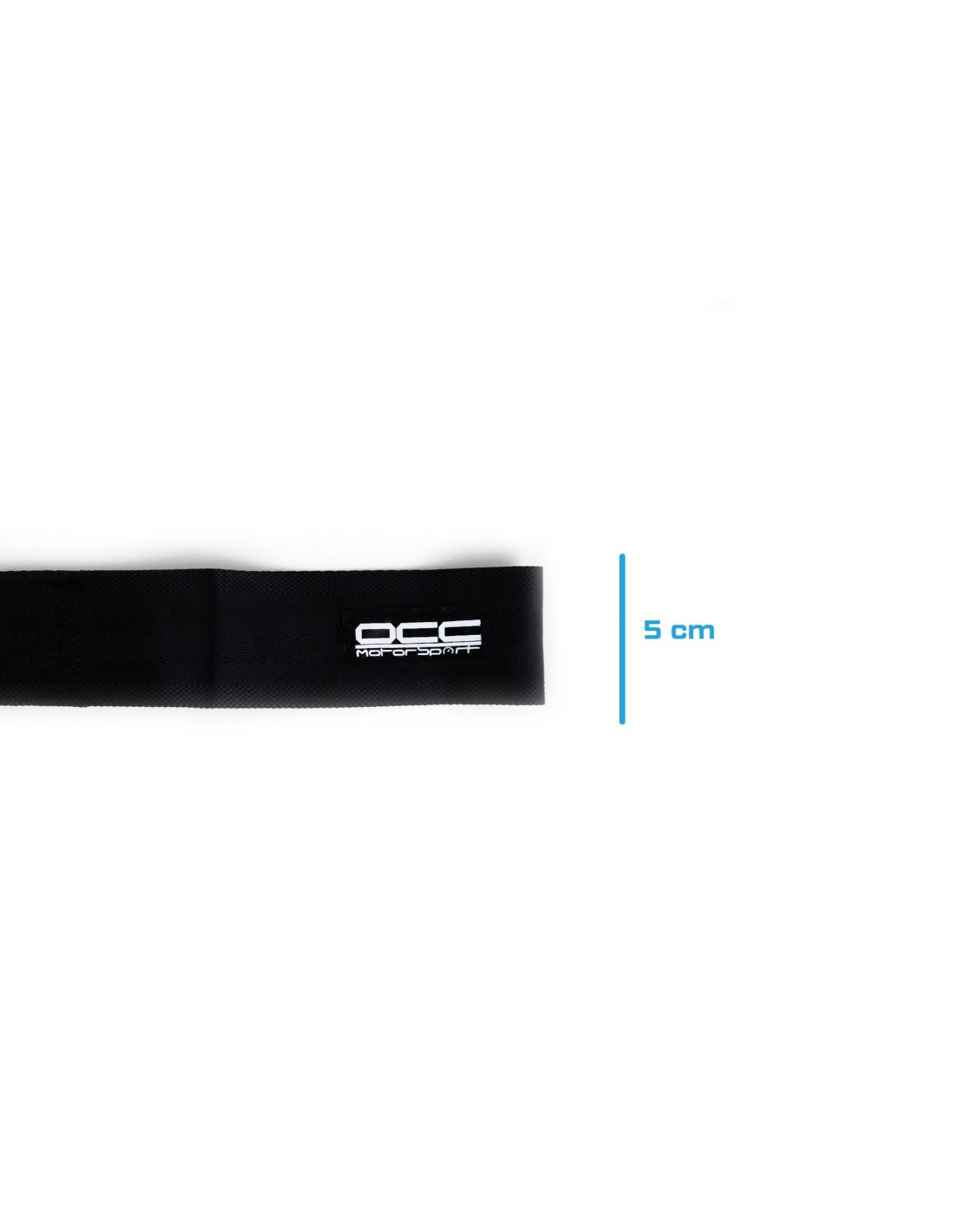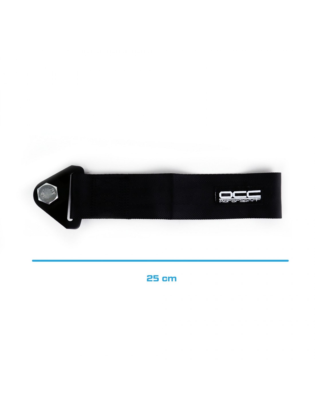 Cinta de remolque de la marca OCC Sport. De color negro. Longitud de 25cm y un ancho de 5cm. El gancho cuenta con un agujero para un perno de 15mm.