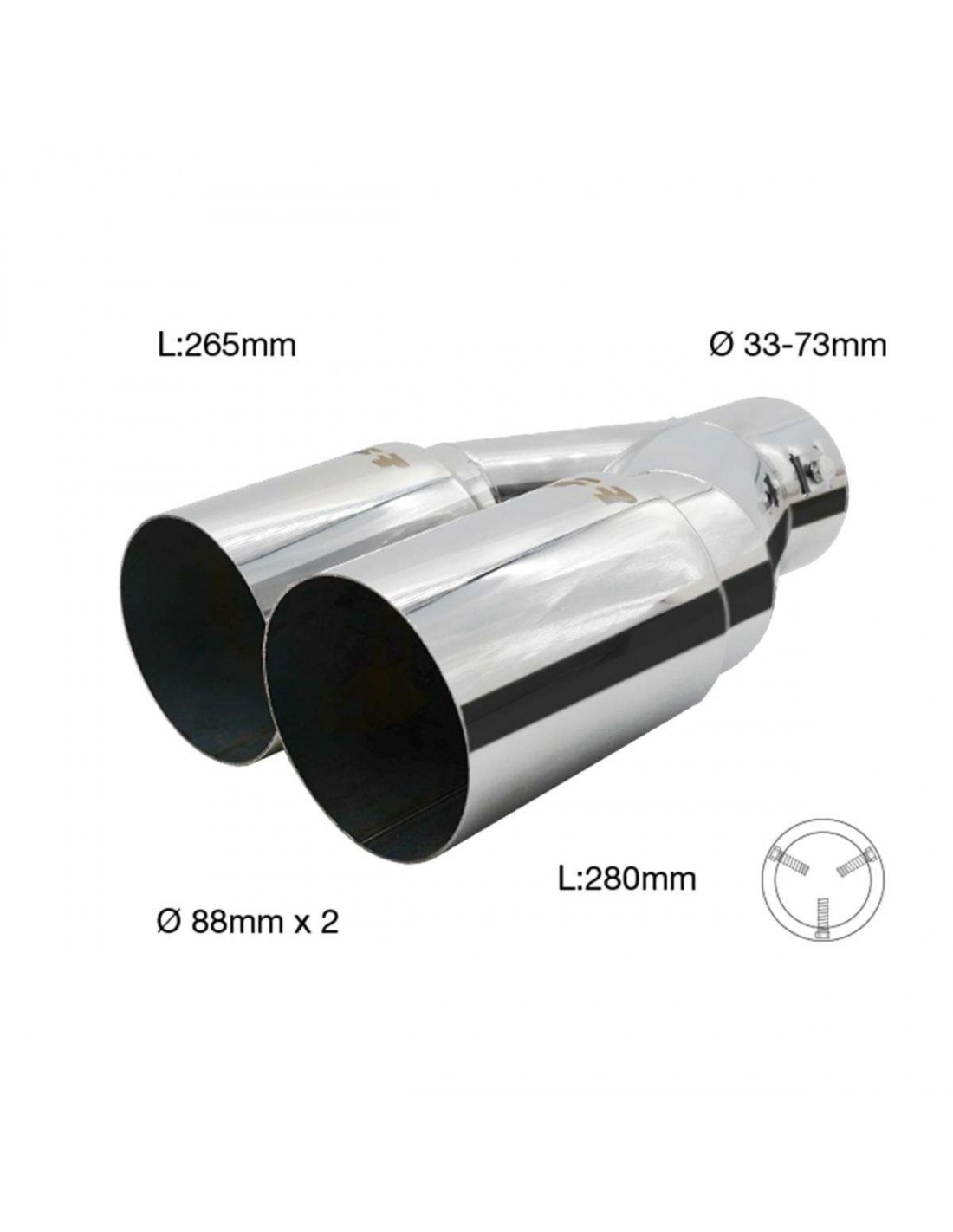 Cola de escape universal de la marca Simoni Racing. Cola de escape de acero inoxidable con la salida redonda doble de 88mm cada una. Fijación mediante tornillos para tubos entre 33 y 73mm. Longitud de 265 y 280mm, diseñado para poder ponerse en ambos lados del parachoques trasero.