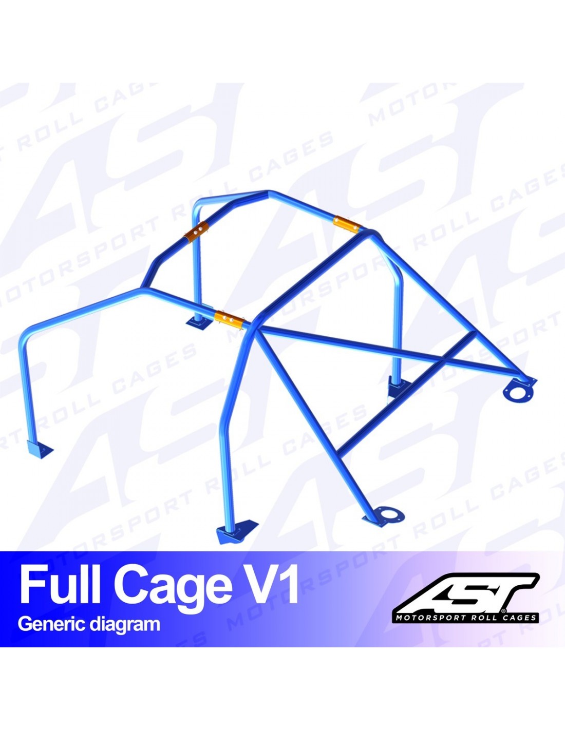 Arco de seguridad AST Full Cage V1 con 6 puntos de anclaje a la carrocería, atornillado sobre 6 bases soldadas a la carrocería. Estas bases son de acero de 3mm de espesor y están diseñadas y fabricadas específicamente para cada coche, consiguiendo una seguridad y una adaptación máximas sobre el chasis. La estructura de seguridad se entrega soldada y sin pintar. Arco principal fabricado en acero E355 con un diámetro de 45mm, el resto de la estructura está fabricada en acero E355 con un diámetro de 40mm. La estructura va separada mediante casquillos de unión en varias partes para poder introducirla dentro del vehículo.