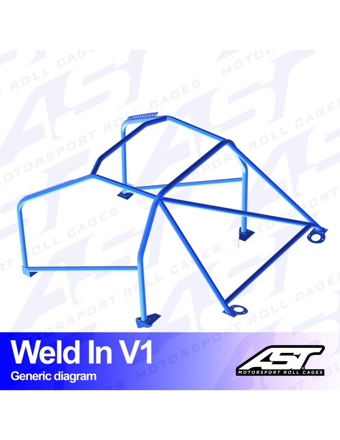 Arco de seguridad AST Weld In V1 con 8 puntos de unión la carrocería. Las bases del suelo son de acero de 3mm de espesor y están diseñadas y fabricadas específicamente para cada coche, consiguiendo una seguridad y una adaptación máximas sobre el chasis. La estructura de seguridad se entrega en kit para soldar y sin pintar, y se compone de un arco principal de acero E355 con un diámetro de 45mm, el resto de la estructura está fabricada en acero E355 con un diámetro de 40mm.