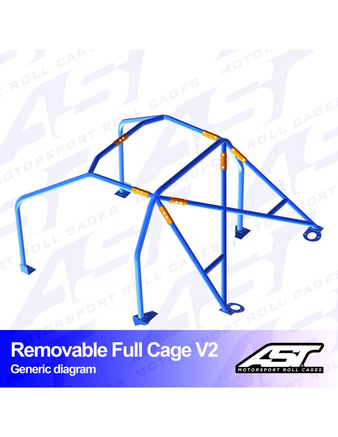 Arco de seguridad AST Removable Full Cage V2 con 6 puntos de anclaje a la carrocería, atornillado sobre 6 bases soldadas a la carrocería. Estas bases son de acero de 3mm de espesor y están diseñadas y fabricadas específicamente para cada coche, consiguiendo una seguridad y una adaptación máximas sobre el chasis. La estructura de seguridad se entrega soldada y sin pintar. Arco principal fabricado en acero E355 con un diámetro de 45mm, el resto de la estructura está fabricada en acero E355 con un diámetro de 40mm. La estructura va separada mediante casquillos de unión en varias partes para poder introducirla dentro del vehículo.
